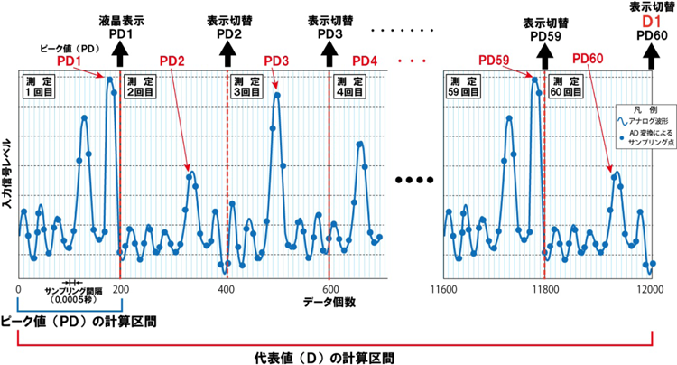 代表値(D)は、任意の時間のピーク値(PD)の上位n個の平均を求めたもので、平均データ数設定AVE(n)で決定します。任意の時間は、表2のようにサンプル数の設定値で決まります。