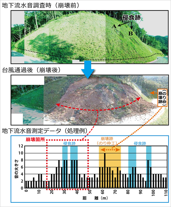 次に、本手法が崩壊箇所の予測に適用できるかを検証するため、実際の山地斜面において地下水が集中する場所を探索し、崩壊発生場所の予測を試みました。現地踏査により、周囲の斜面に比較して地下流水音が大きく、地下水が集中していると考えられる場所を抽出しました。この調査の後、この斜面が台風にともなう豪雨にみまわれ、事前に特定した危険箇所が実際に崩壊したことで、予測においても本手法の有効性を実証されました(図2)。